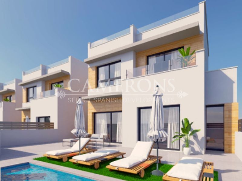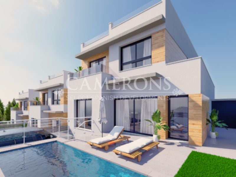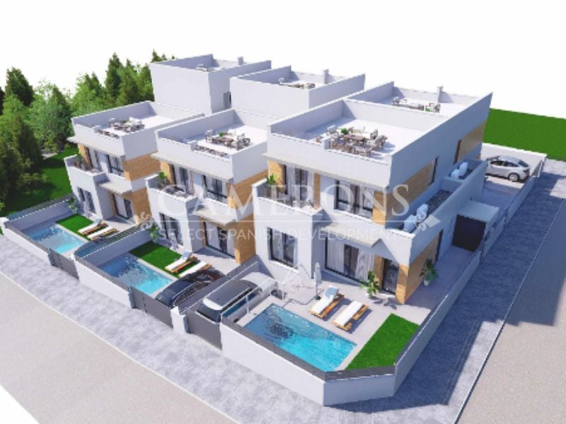 Newly released development of modern 6 villas in Benijófar, a charming Spanish village located between the towns of Guardamar and Torrevieja, with all the daily necessities within walking distance. Two major golf courses are within 10 minutes’ drive, and the fantastic Guardamar beach is only 15 minutes away by car.Modern two-floor levels villas with 3 bedrooms, 3 bathrooms and a private solarium. The property also includes a private pool.Ground floor with spacious lounge area, modern kitchen a...