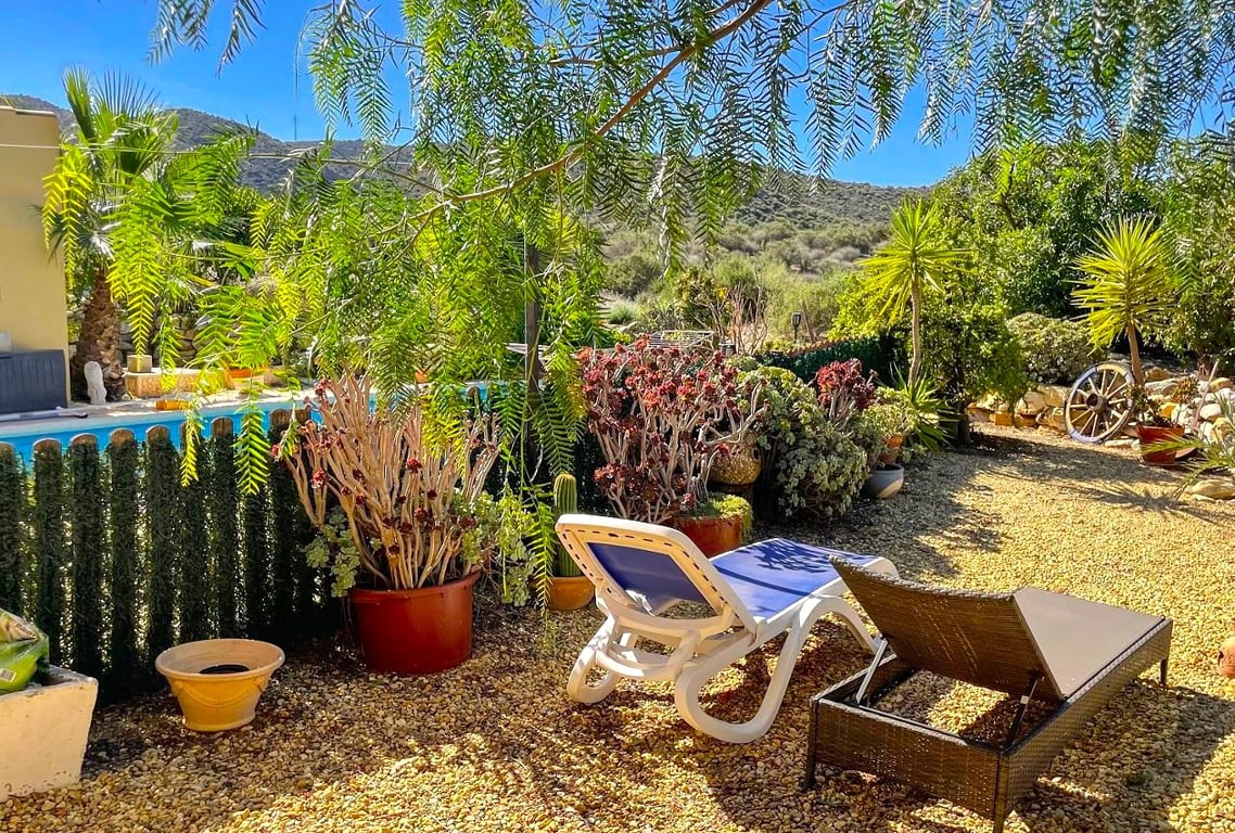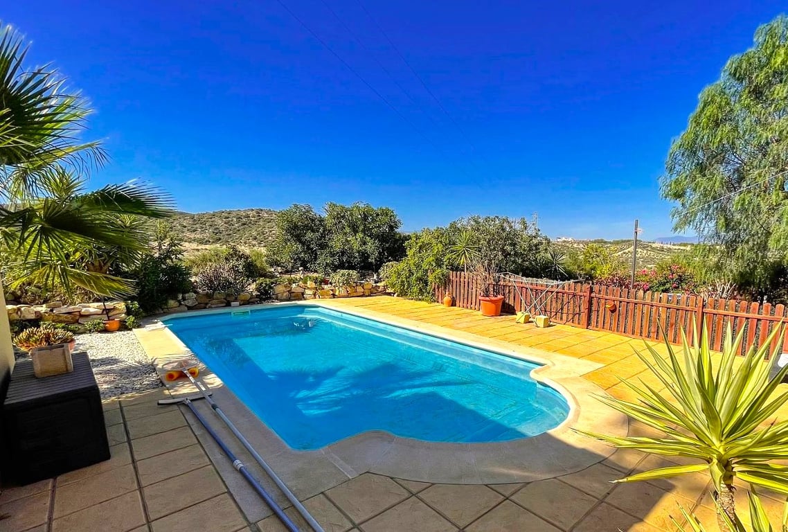 Well maintained, the villa showcases three bedrooms two of which have with built-in wardrobes the other is currently being used as an office, two bathrooms (including an en-suite in the master bedroom), a generous lounge adorned with a wood burning stove, and front doors that lead to a covered terrace that leads around to the pool and beautiful garden area. The well-equipped kitchen perfectly complements the living space. Outside, apart from the stunning views, there is a front terrace, ample pa...
