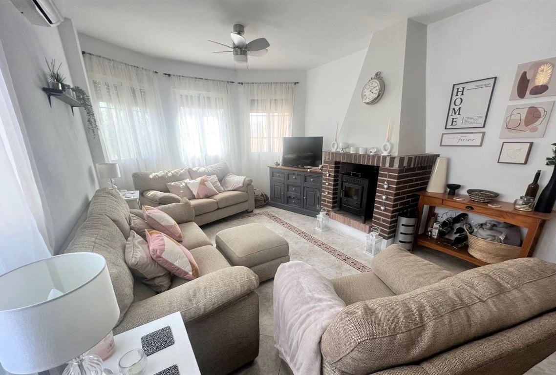 The gardens are laid to gravel for ease of maintenance with established orange and lemon trees. There is a COVERED PERGODA from which to enjoy shade and relax taking in the fabulous views. The SWIMMING POOL is 8 x 4 m and has recently been completely refurbished- It is surrounded by terrace for soaking up the suns rays. To the front of the villa is a COVERED TERRACE perfect for alfresco dining and which has wide arches, again from which to enjoy the view. From the covered terrace the front door...