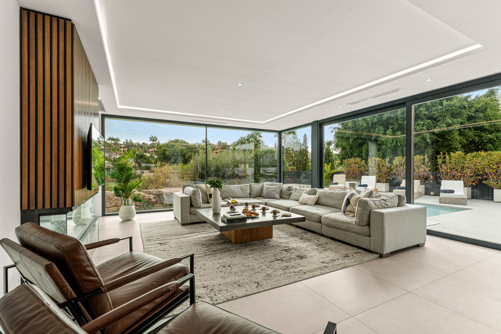 Featuring a striking expression of contemporary architecture, this modern frontline golf villa for sale in El Paraiso, Estepona, occupies one of the most sought-after positions overlooking the golf course. Completed in 2023, it is the creation of a renowned architect celebrated for blending modern design with practical elegance, resulting in a residence that is both visually captivating and perfectly suited to daily life. Inside, five generous bedrooms include four en suites, complemented by th...