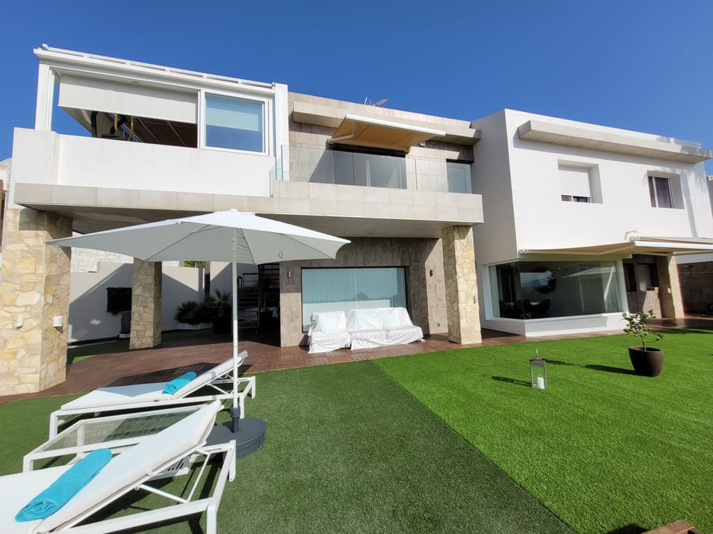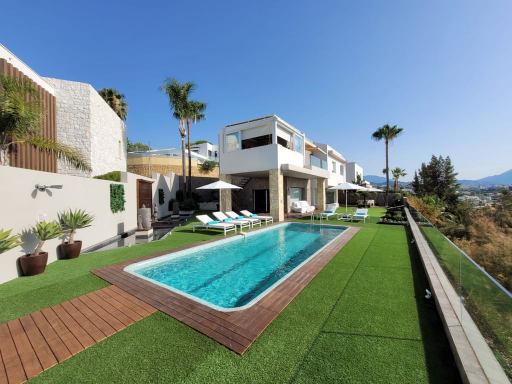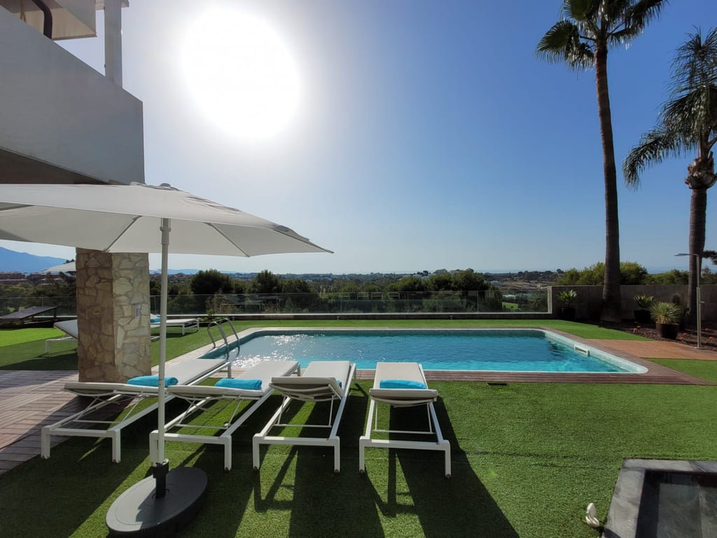Villa for sale in Nueva Atalaya, Benahavis, with stunning panoramic views to the sea, golf and the mythical mountain of Marbella, La Concha. The house is located in a very quiet street, front line to Atalaya golf. The villa is very private and was recently renovated. It is in excellent condition and has been designed for easy maintenance. Heated swimming pool with salt water, nicely decorated outside terraces, to enjoy the fantastic panoramic views all day long. The house has 3 levels. On the gr...