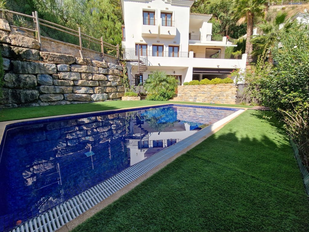 Five-bedroom villa for sale in the exclusive Benahavis Country Club area, with sea and mountain views. Expect the spectacular views and privacy, surrounded by the comforts of the Country Club. The property resides in Benahavis, which is just 10 minutes from Marbella, Puerto Banus and San Pedro de Alcantara. A large property of 492 m2 built, it has four levels and delivers panoramic views to the sea. Outside, there is a garden with mature palm trees, grass areas and swimming pool. Plenty of terr...