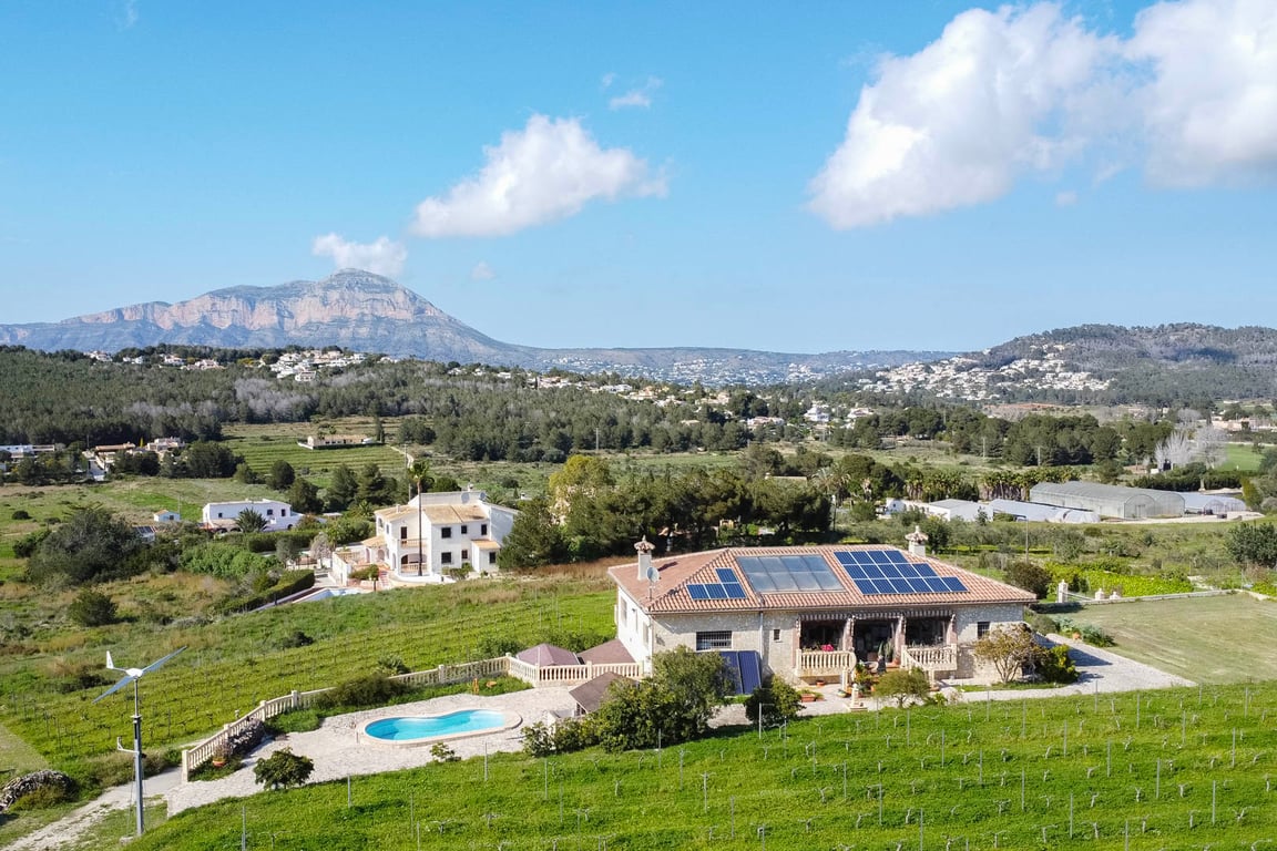 This beautiful country house is located on a plot of over 10,000 m2, centrally situated in the valley between Benitachell and the bay of Jávea. The property enjoys panoramic views over the rolling landscape all the way to the Montgó mountain in Jávea.On the south side of the villa there is a large naya with a fireplace. From here, a long hallway provides access to the kitchen, dining room, living room with fireplace, guest toilet and a double bedroom. The hallway ends in a spacious double bedroo...