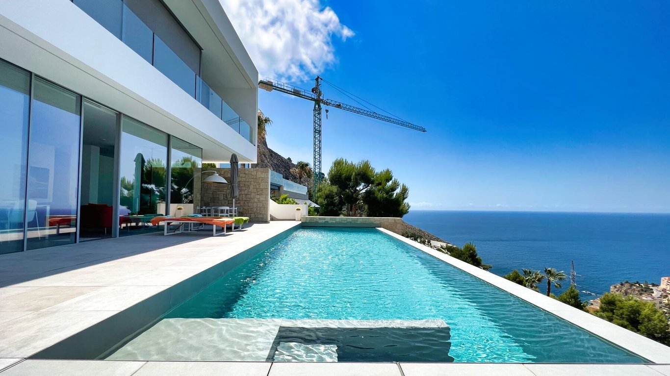 This stunning, modern luxury villa is nestled atop the highest peak of Mascarat, offering unparalleled views of the bay, the Mediterranean Sea, and the port of Campomanes. The villa boasts a sprawling built area of 221 m2 on an 1638 m2 plot, promising an opulent and peaceful abode. Access to this beautiful house is via a garage that not only provides an awe-inspiring vista but also houses a lift connecting all levels of the home and ample storage space. Descending from the garage via stairs or l...