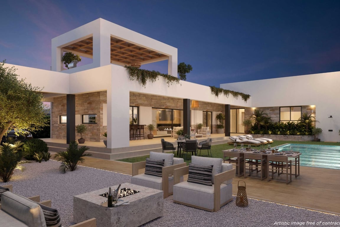 Welcome to this exclusive contemporary villa, a home where Mediterranean design blends seamlessly with modern architecture, natural materials, and open spaces created for enjoying outdoor living year-round.Designed on a single level, the property offers three spacious bedrooms and three elegant bathrooms, carefully arranged to ensure comfort and privacy.Natural light floods every corner, enhancing the warm tones of the stone, wood, and neutral finishes.The exterior has been designed as a true oa...