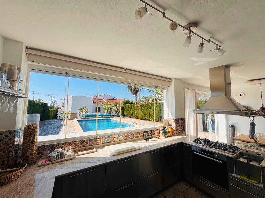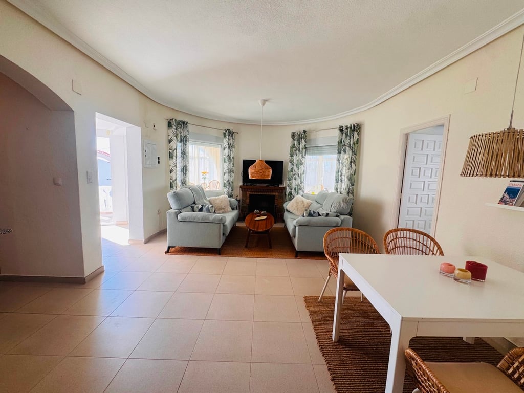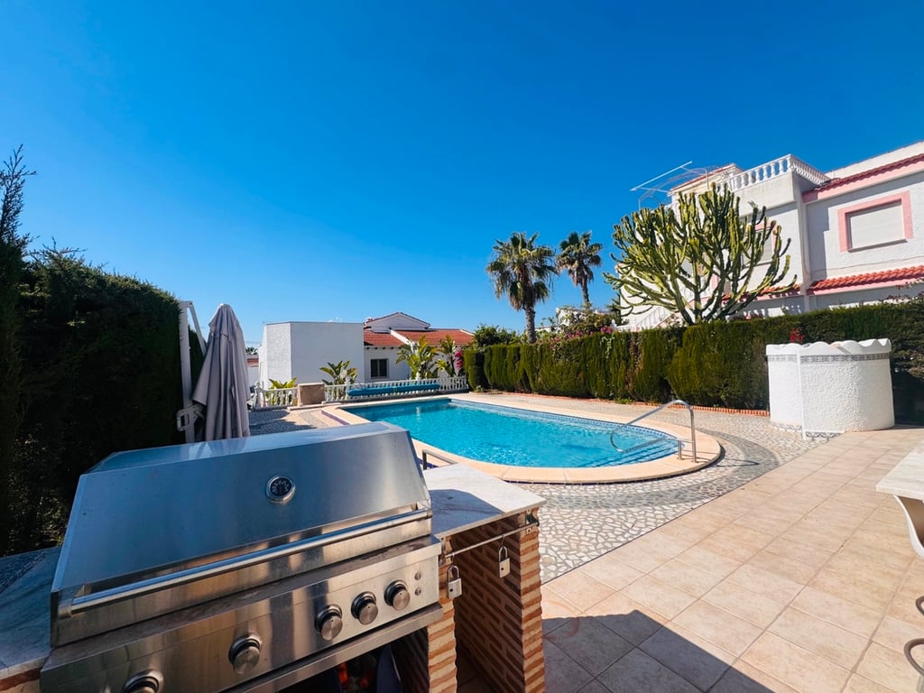 This well-presented 3-bedroom, 2-bathroom villa is ideally located just 200 metres from the town centre of Ciudad Quesada, offering both convenience and privacy on a generous 800 m2 plot.The property boasts a beautifully maintained rear garden, perfect for outdoor living, featuring a private heated swimming pool and a stylish pool house complete with a kitchen and lounge area—ideal for relaxing or entertaining.Inside, the villa offers comfortable and bright living spaces, while outside there is ...