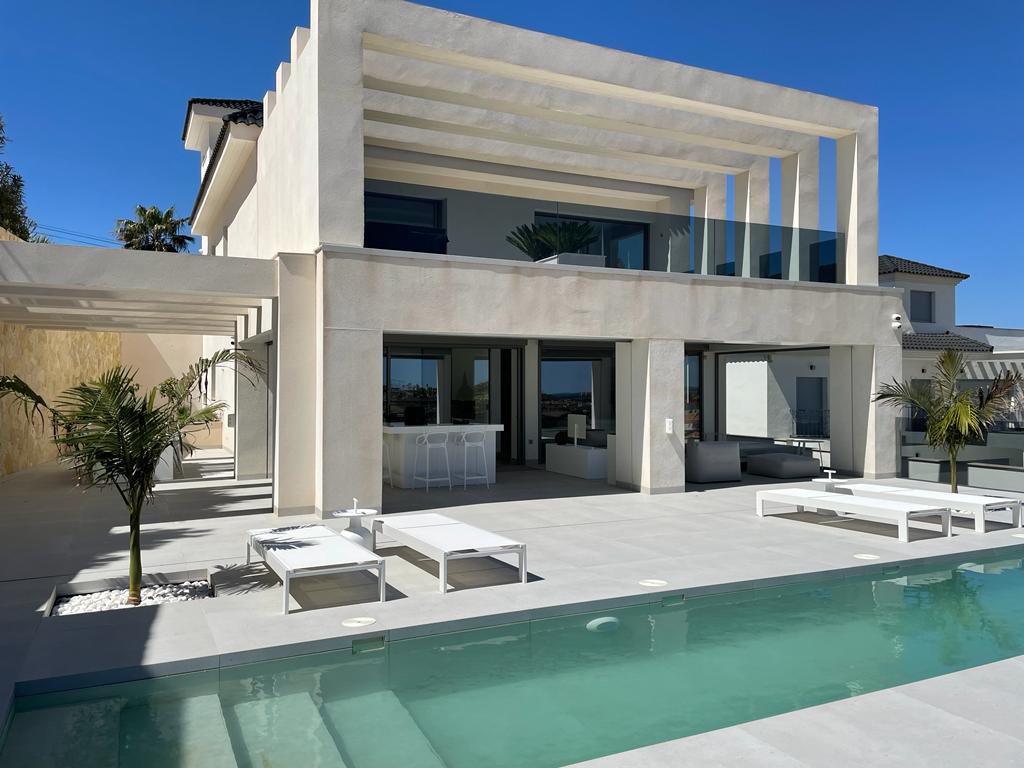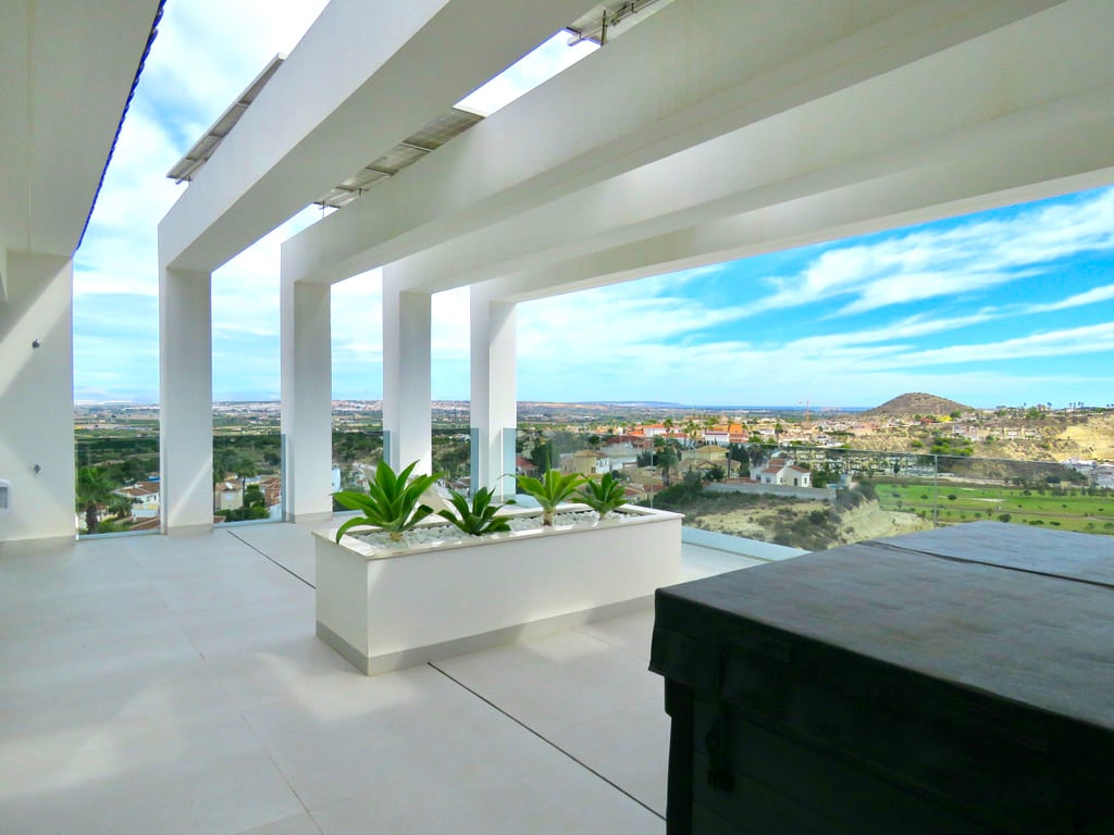 UNIQUE ONE OFF LUXURY 4 BEDROOM DESIGN VILLA WITH MAGNIFICENT VIEWS OVERLOOKING THE GOLF COURSE AND LOCATED IN CIUDAD QUESADA, ALICANTE, COSTA BLANCA. Fully finished, totally furnished design villa. This villa is equipped with the latest tecnology and all the materials have been thoroughly chosen. On the groundfloor there is the kitchen living and dining area, utility area and also the covered terrace. In the first floor we have 3 bedrooms and 3 bathrooms. The garage level is ofcourse the garage...