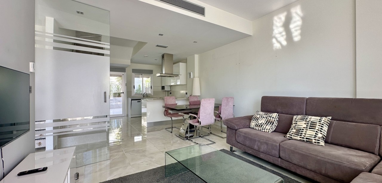 Discover this beautifully maintained detached villa located in the sought-after area of Lomas de Cabo Roig / Los Dolses, Orihuela Costa. Built in 2016, this modern home offers 125 m2 of space across three floors, set on a 230 m2 plot. The ground floor includes a bright living area with underfloor heating, a fully equipped kitchen, and a bedroom with a separate bathroom. Upstairs are two spacious bedrooms, each with its own en-suite bathroom, plus a glass-enclosed terrace with sea views. Outsid...