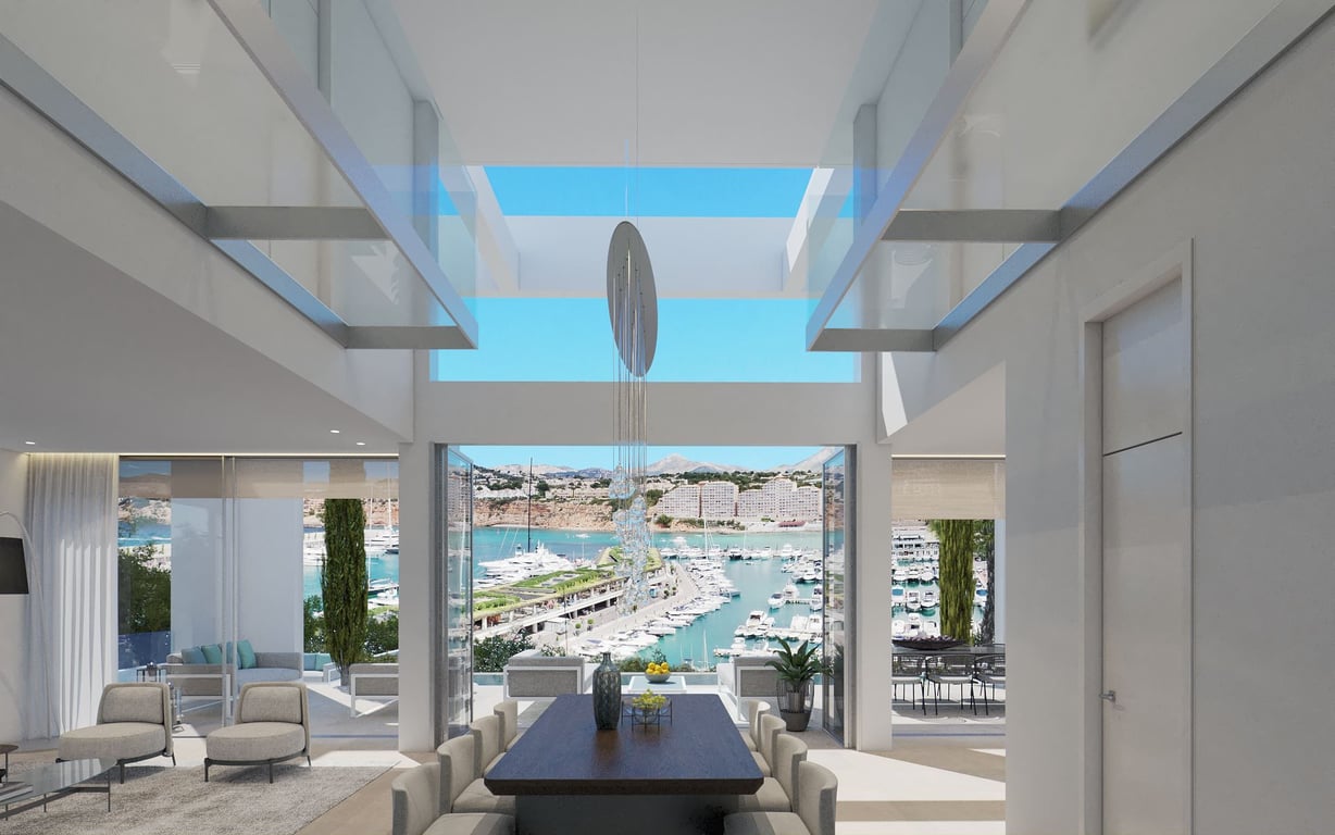 Project: A masterpiece of architecture and design. Ultra modern luxury villa above the port of Port Adriano with fantastic sea and distant views. Over 600m2 constructed area with 4 bedrooms, high, open and light-filled living-dining area with glass elements and lift. Furthermore, the property has underfloor heating, air conditioning, wine cellar, sauna, gym, double garage, domestic system and sound system, garden and overflow pool, as well as a massive roof terrace with picturesque views. A dr...