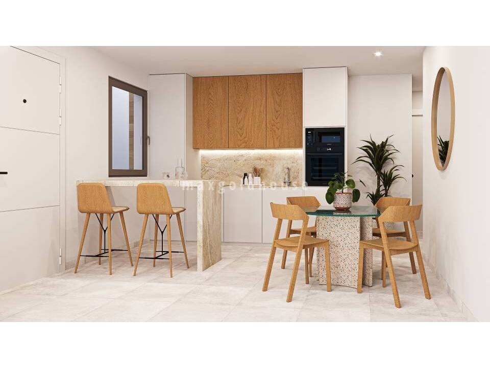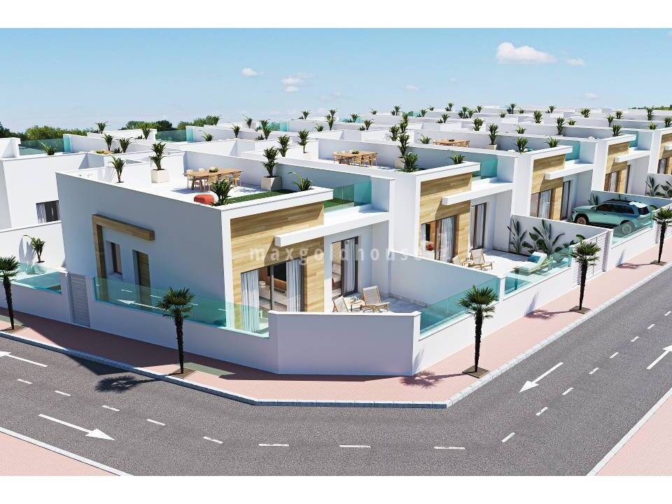 New development in El Jimenado, a small Spanish village with a medical center, a shop, some bars etc., that is part of the bigger village of Torre Pacheco, and only 15-20 minutes drive to Mar Menor sea and beaches. There will be built villas on one level with 3 bedrooms, 2 bathrooms, and an open living / dining room with open kitchen. There is a good sized garden with private pool and shower, and a 80 sqm solarium where you have the sun all day. Included in the price are pre-installation for air...
