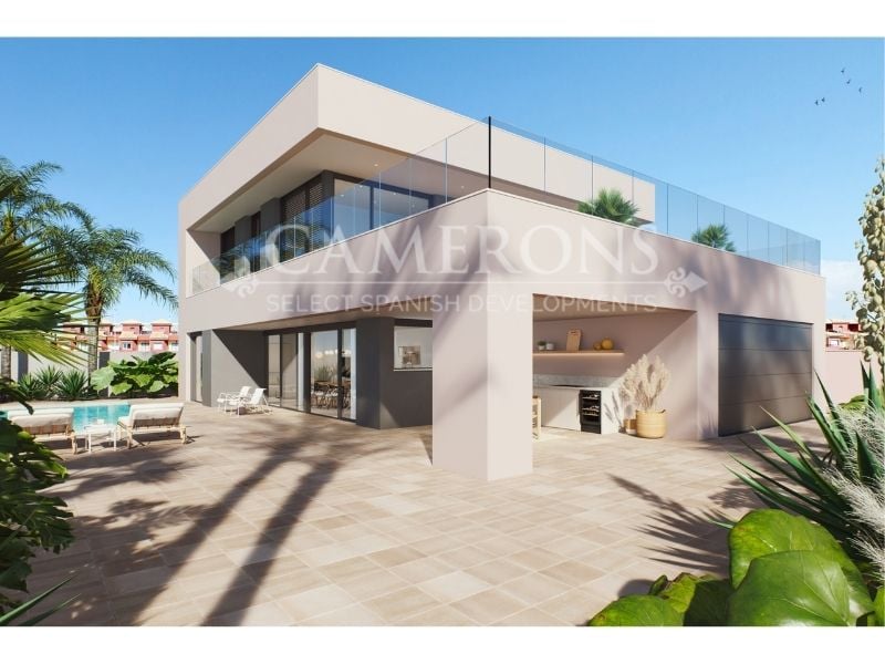 Fantastic beach villa in La Zenia, just 50m from the sea.This luxurious villa has independent access from the surrounding streets, as there is no adjacent building.Low traffic streets with large green areas around the residential, these aspects are ideal for young family members.The villa features a large plot and a built area of 344 m2.The villa is built with five bedrooms. Two of the bedrooms come complete with a bathroom and dressing room. The kitchen is fully finished, with high quality ma...