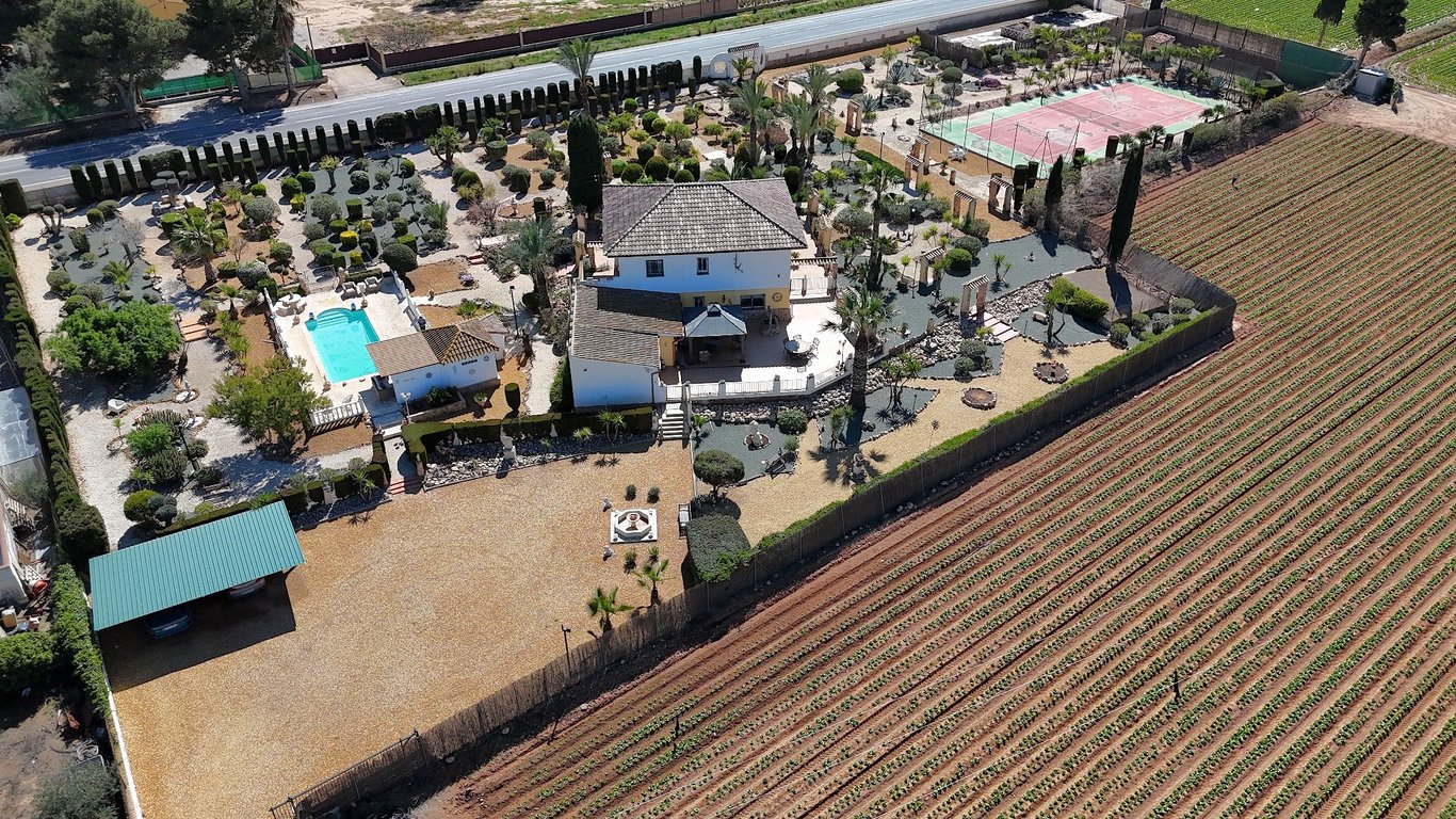 Impressive 5/6 bed 2 bath large 2 storey detached Country Villa enjoying privacy, with large conservatory, huge car port for three vehicles, extensive terraces around a 9mx4m swimming pool, bar with adjacent pool bathroom and covered terrace overlooking the pool, sitting and dining areas, pool room, boiler room, workshop, beautifully landscaped established gardens , a full-sized tennis court, etc; set on a gated flat plot of 6013 sq. Metres. Located in the countryside within walking distance of ...