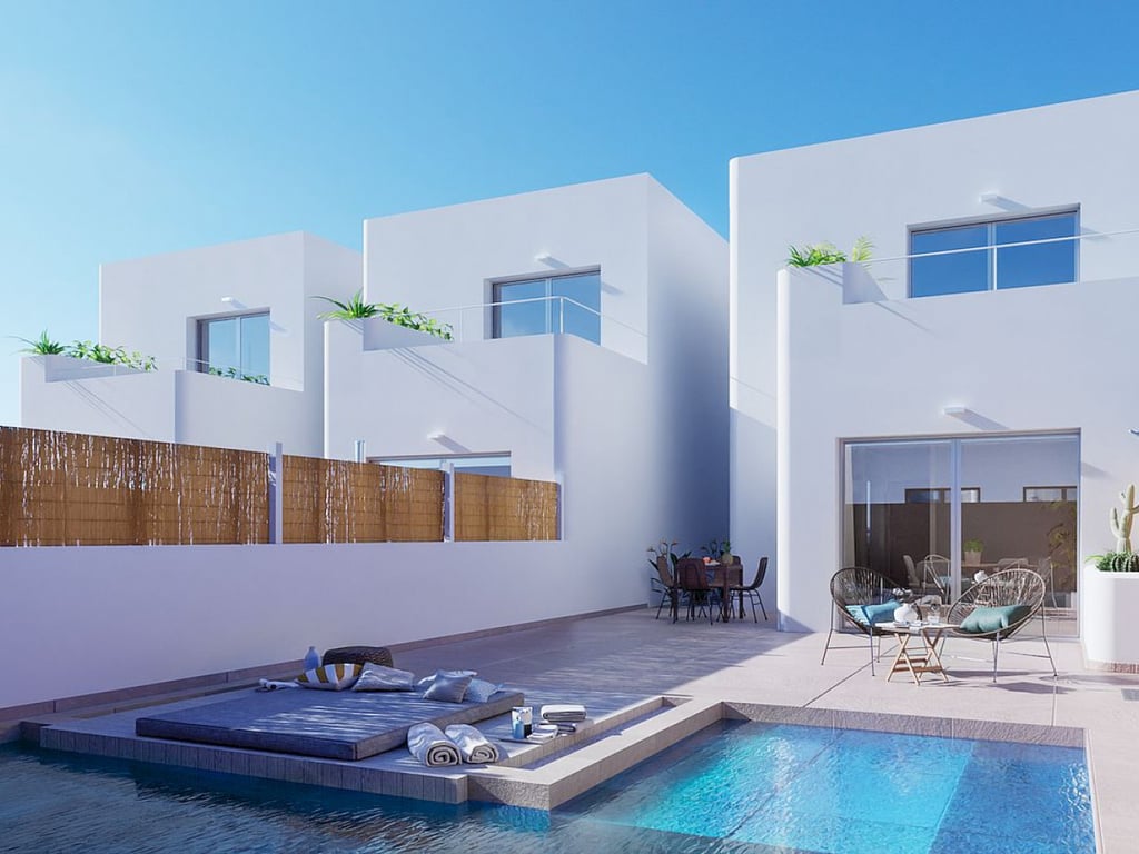 Three bedroom villas with private pool in Los Alcazares These stunning villas which are located in Los Alcazares, have three bedrooms and two bathrooms, a private swimming pool and parking space on own plot. The residence consists of detached and semi-detached Ibiza style villas (choice of two models) on independent plots with terrace. The Mykonos model is a two level villa, on the ground floor of the house there is a spacious lounge with kitchen and dining area in bright, open plan. On t...