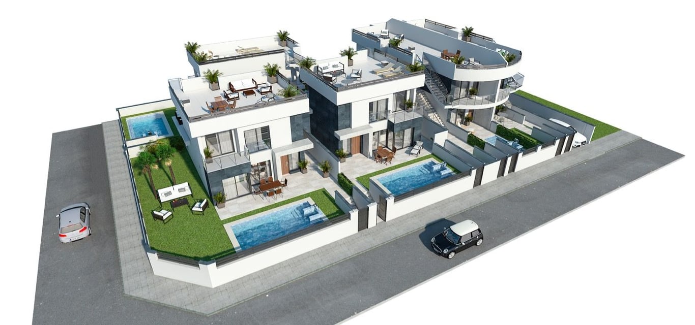 The property will meet the highest standards and will be equipped with:. . Private swimming pool with shower.. Kitchen completely furnished and equipped with oven, microwave, fridge, integrated dishwasher, hob and extractor fan.. Lighting: LED inside the property (dining room, kitchen, corridors and bathrooms), and well as in outdoor areas.. Lined wardrobes with drawers.. Fully fitted bathrooms with suspended toilet, vanity unit, mirror and shower with screen panel.. Pre-installation for air con...