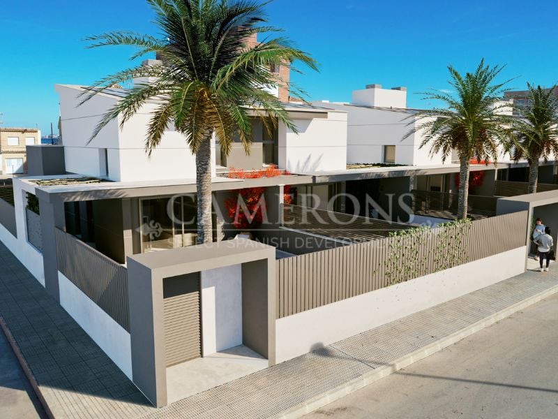 New development of 6 modern two-level villas including private pool, and solarium with summer kitchen only 100m from the beaches of the Mar Menor, in the charming fishing village of Los Nietos.All villas have 3 bedrooms and 3 bathrooms, and come complete with fitted wardrobes, finished bathrooms, internal / external lighting, private pool, summer kitchen on the solarium and white goods.Great access to all the services for everyday life such as restaurants, bars with an exquisite cuisine, educat...