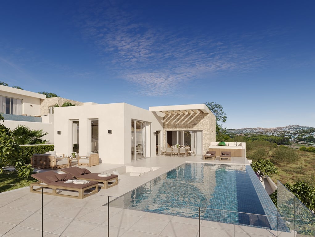 This luxurious villa is a new real estate development in a truly outstanding location – just a few minutes' walk from both the beach and the authentic center of Moraira. The property enjoys impressive views over the valley.The sandy beach of Platja de l'Ampolla is only a 7-minute walk away, less than 700 meters from the villa. Shops, restaurants, bars, and the marina are also within easy walking distance of your future home.This spacious detached villa is distributed over two levels and offers a...