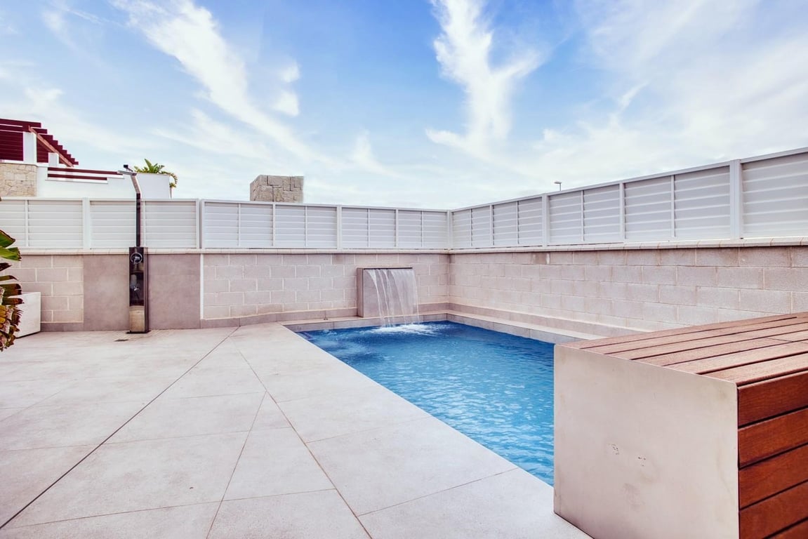 This 3-bedroom, 2-bathroom villa features a spacious living and dining area with large sliding windows opening onto the terrace and swimming pool, an open-plan kitchen, three bedrooms, and two bathrooms. All bedrooms include built-in wardrobes. The master bedroom has an en-suite bathroom. The property enjoys a beautiful rooftop solarium. The villa also includes a basement level (60 m2). The villa is equipped with: • Swimming pool (6m x 3m) with waterfall • Pre-installation for an electric entr...
