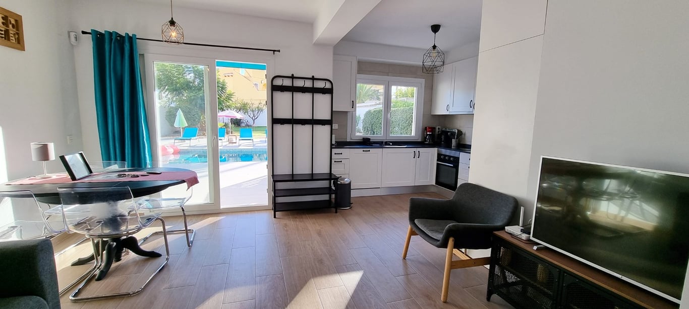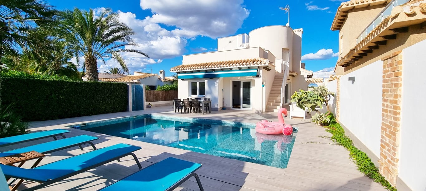 A newly renovated 4 bed 3 bath detached villa with a private swimming pool located just 100m from the beach in Playa Flamenca, Costa Blanca South. This property is offered for sale in very good condition as it has been renovated, sold furnished & very briefly consists of the following:- On the first floor there is a lounge/diner with hot and cold A/C, open plan kitchen, 3 x bedrooms & 2 x shower rooms. On the 1st floor is the main large double bedroom, shower room, large balcony & a pri...