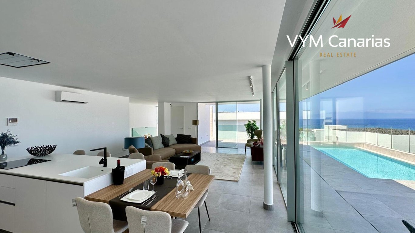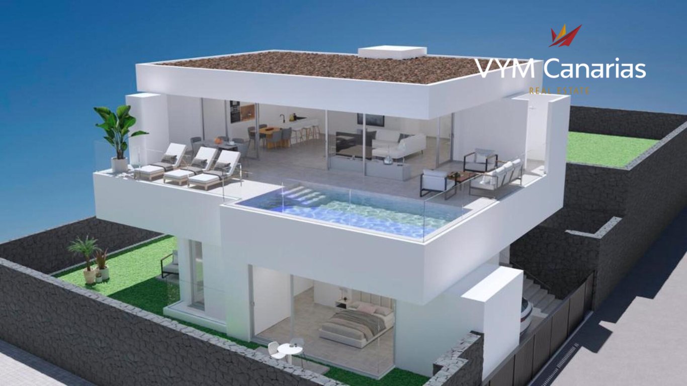 VYM Canarias offers for sale a villa in the final stage of construction in the "Sybaris Premium Villas" complex, Rokabella. The villa is located 100 meters from the ocean on a plot of land of almost 300 m2. The house with elevator has a garage and 2 main floors: on the main floor there are three bedrooms with fitted wardrobes, bathrooms and terraces. Top floor with open plan kitchen, living room, bathroom and large terrace with swimming pool and solarium. Rokabella is a new developing urbanizati...