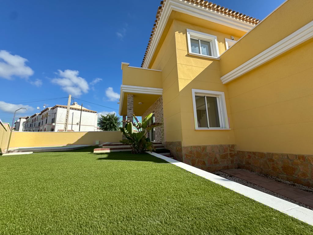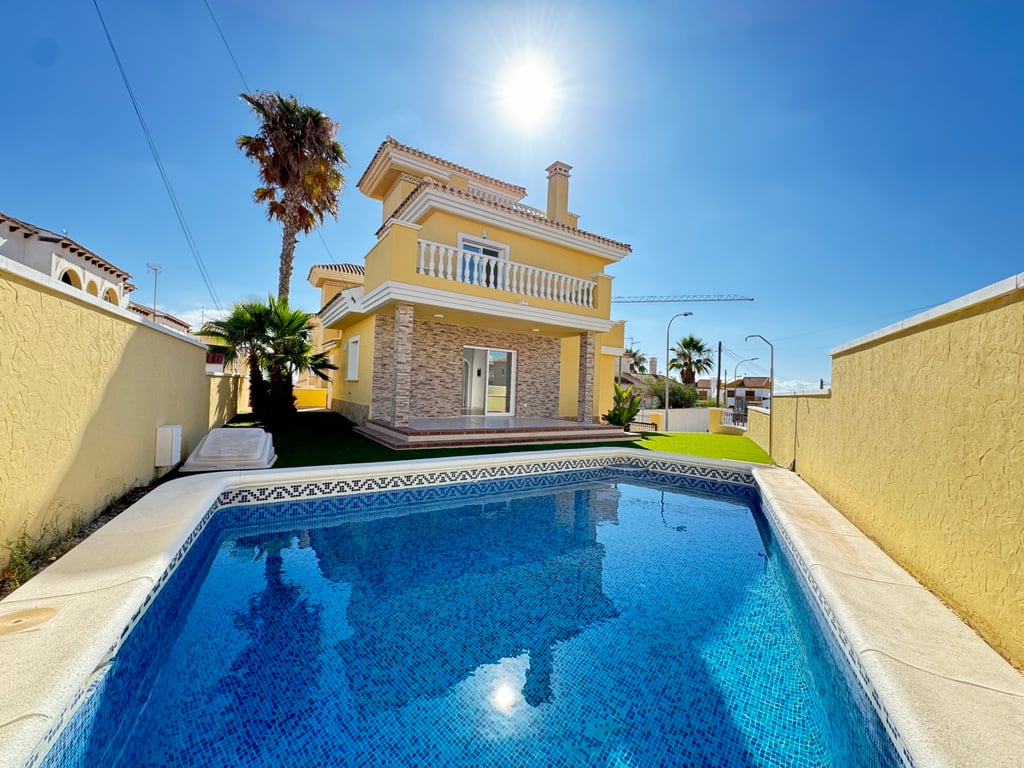This impressive 3 bedrooms, 2 bathroom Villa is located in El Galan, Villamartin. The property is positioned on a spacious corner plot and has recently underwent refurbishments throughout. Outside you have a beautifully presented garden with private pool, artificial grass, off-road parking for 1 car and the use of multiple terraces. Inside you have a brand new kitchen, including appliances, spacious lounge with fireplace, 3rd bedroom with modern shower room and a store cupboard. The lounge offer...