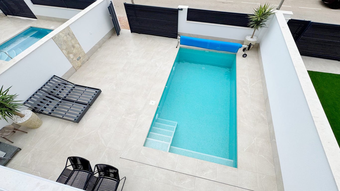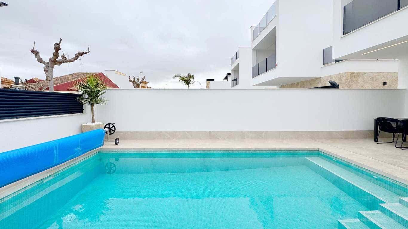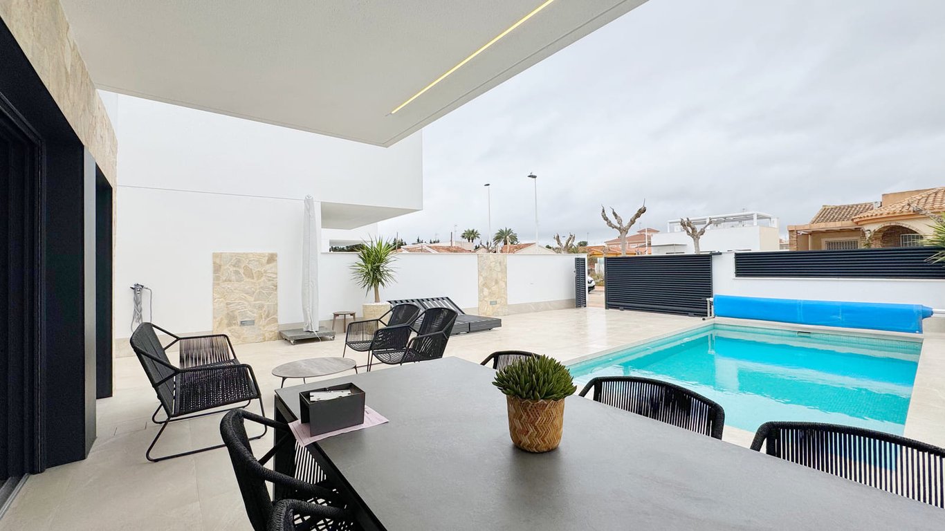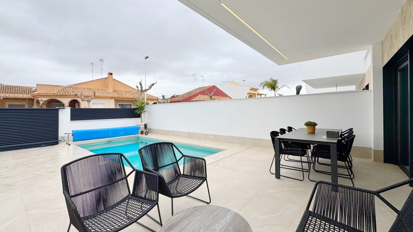 Translated to English: Fantástica villa independiente con piscina privada situada en San Pedro del Pinatar, en una zona residencial tranquila a pocos minutos del mar y de todos los servicios. La vivienda cuenta con tres dormitorios y tres baños, distribuidos en dos plantas que ofrecen espacios amplios, luminosos y funcionales para disfrutar tanto en vacaciones como durante todo el año. El salón-comedor se conecta con una cocina abierta y con salida directa a la zona exterior, donde se encuentra ...