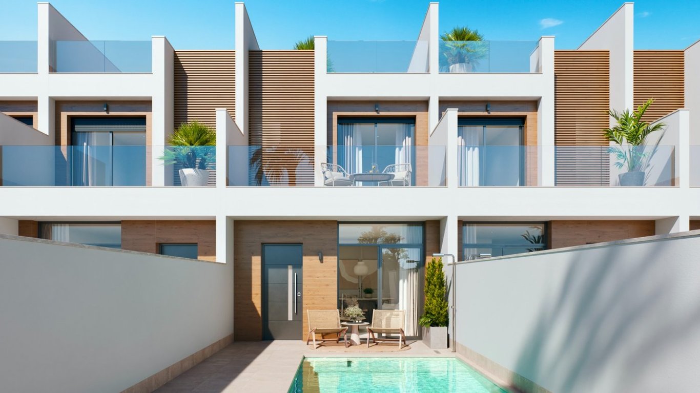 KEY READY, fully furnished and inclusive 2 A/C units and all white goods. 3 bedrooms, 2 bathrooms, own pool, 35m2 solarium - only approx 5 - 8 min walk from the town centre of San Pedro del Pinatar and 5 min drive from the beaches. All villas have off road parking.~~From the entrance to the plot, you pass the pool and enter the villa under the covered porch.~~On the ground floor you have a good size lounge with open kitchen - views to the pool. Kitchen comes with all appliances (except washing m...