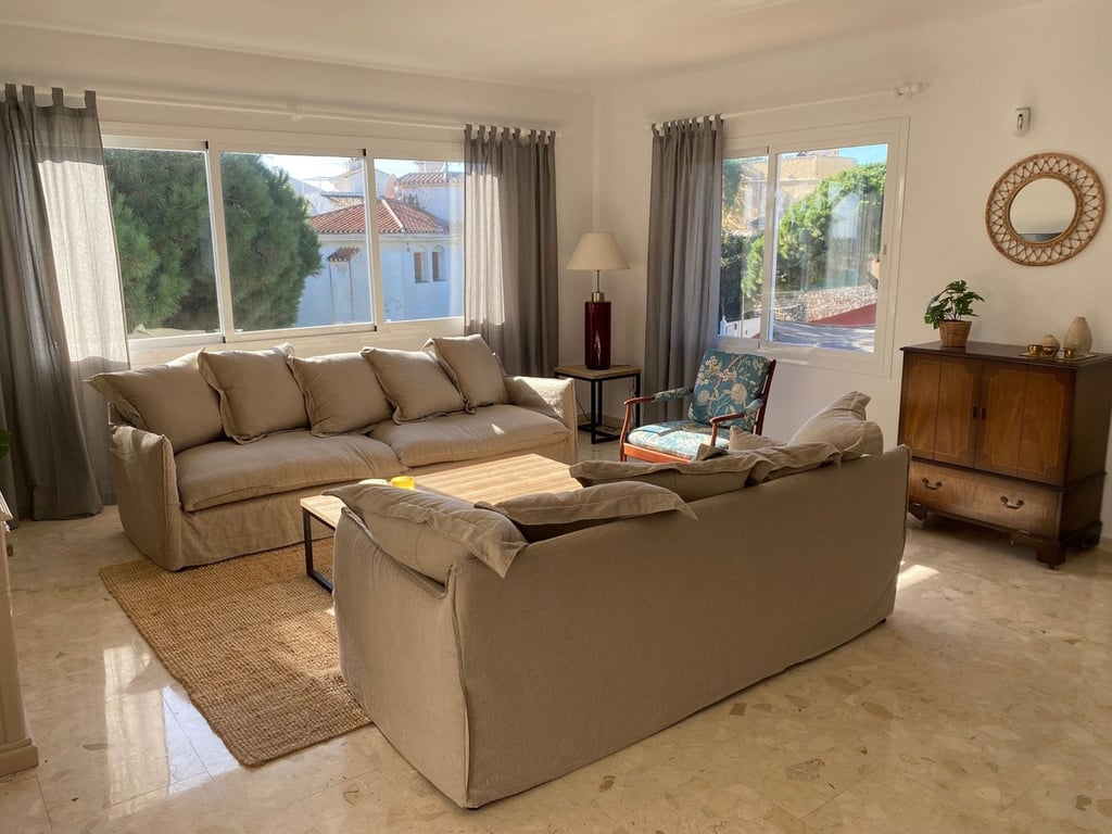 Villa within walking distance to the beach for sale in Calahonda, Mijas Costa. This villa was renovated (2023/2024) in most areas and a brand new terrace and pool area have been built. You find that the pool is heated, a barbecue area, an outside dining area with an extra gas grill, room for entertainment currently used for table tennis and nice gardens around. Overall a beautiful family home located on a quiet street, 150 meters to restaurants and 700 meters to the beach. Great rental potential...