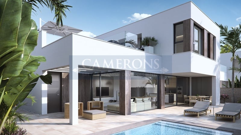 Here we have a fantastic new release of 12 high specification modern detached villas with private pools and parking space, second line to a fantastic beach in Torre de la Horadada.This is a new release of super high quality, cleverly designed properties with 3 or 4 bedrooms and 3 bathrooms. Constructed on plots from 240m2 to 465m2 with a spacious internal area; there are different lay outs depending if it is 3 bedrooms or 4. We found a large open plan living space features a large ‘u’ shaped kit...