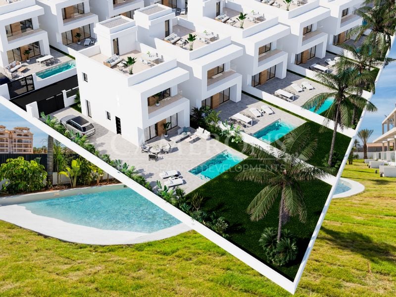 Fantastic project of 20 new built villas with three bedrooms, three bathrooms, private pool and solarium in the sought after area of La Zenia.The villas have two floors plus a sunny roof terrace with a lovely view of the surroundings.The ground floor has an open plan between the modern kitchen and living room, a spacious bedroom with built-in wardrobe and a bathroom. The living room has direct access to the garden and pool area through large glass doors, which also lets in lots of natural light....