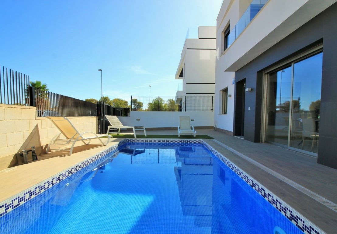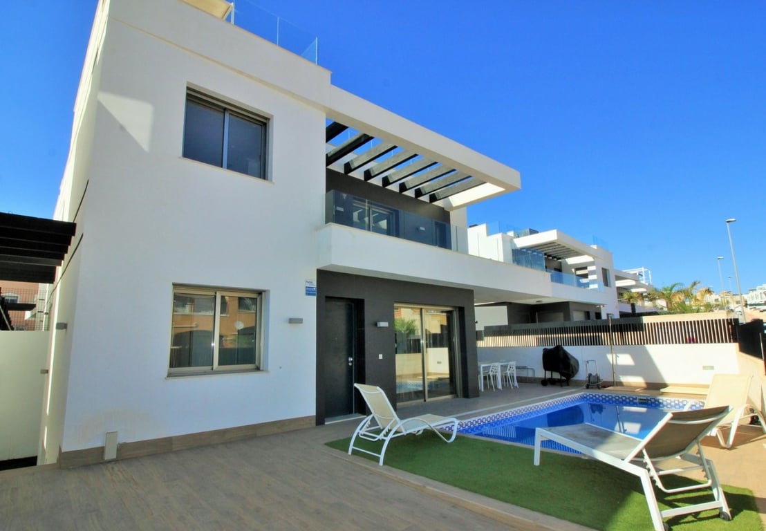 Bargain! Large Detached Villa with Private Pool in Villamartin/ Playa Flamenca 5 bedrooms 4 bathrooms Private Pool Terrace Solarium Storage A/C Luxury 5 bedroom, 4 bathroom detached villa with private pool and underbuild for sale in the Pau 26 area of Villamartin. This stunning property was built in 2019, and offers great outdoor space including a private garden with off-road parking, private swimming pool, private balcony and a large roof solarium. An ideal home for permanent living or used as ...