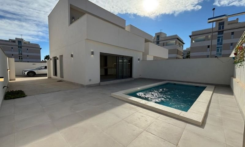 We present this New Build in walking distance from Zenia Boulevard.Brand new semi-detached house with private pool.The house has 3 bedrooms, 2 bathrooms, a spacious and bright living room - kitchen.Outside there is a 177m2 plot with a private pool and private parking.Located close to all kinds of services such as transport, leisure, gas stations, pharmacies...Do not hesitate to contact us to find out about this new development just 3km from the best beaches of Orihuela Costa.