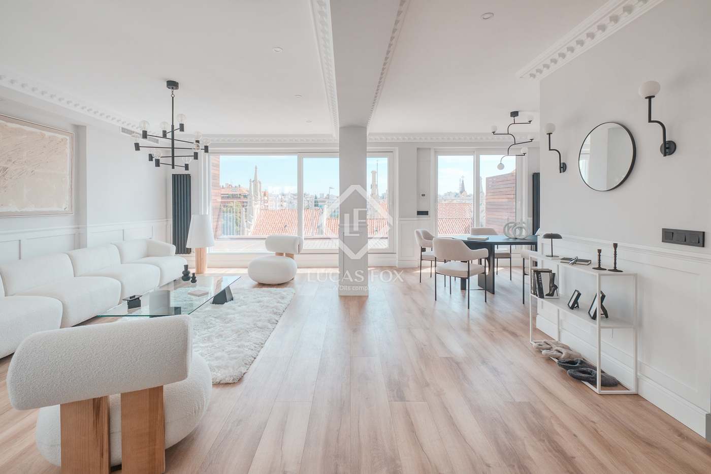 Lucas Fox presents this 347 m2 brand-new flat, refurbished with top-of-the-line finishes and the utmost attention to detail and an old-meets-new, urban vibe, located in the most sought after area of Eixample Right. It is located on the first floor of a royal period building from 1885 with an entrance full of beautiful modernist details, an elevator and concierge service. Composed of four en-suite bedrooms with built-in wardrobes (the crown jewel of them being a huge main suite of about 60 m2, accessible through automatic sliding doors and featuring a typical Catalan 'galería', a small living room adjacent to its own living room and a central bathtub, as well as two separate showers and sinks), a spacious, east-facing, bright living room of 110 m2, featuring a magnificent open-plan kitchen with fitted appliances, a large island bar, a guest toilet, a spacious laundry with seperate washing machine and dryer. As an extra, this listing also includes a storage room of about 9 m2 in the rooftop, accessible via a spacious lift. Completely refurbished from top to bottom, its current owners spared no expense when renovating and used the very best materials: 14 mm. thick, herringbone patterned Italian oak parquet, ducted air conditioning and heating, top-of-the-line acoustic insulation (original exterior carpentry upgraded with brand new 3+3 glass, and electrical mechanisms by Iconico - Palanca collection with brushed nickel finish). There is a Modulnova furnished kitchen and Moongrey surface top, household appliances from De Dietrich and Miele brands (including its 90 cm induction hob and extractor), 2 fitted ovens of 60x60 cm and 60x45 cm as well as a microwave, warming drawer, integrated dishwasher and wine cooler, as well as a Liebherr double American refrigerator. The bedrooms also feature the very best specifications, including Novamobili wardrobes and dressing rooms with smoked glass and matt black profiles, Porcelanosa and Matimex tiles, Nic Design Ovvio sanitary ware, Inbani washbasins, Lasser shower enclosures, brushed-nickel taps by Formma Design and Iconico and a stylish Inbani freestanding bathtub with Solid Surface finish in the main suite. Please feel free to contact us for further information and to arrange a viewing.