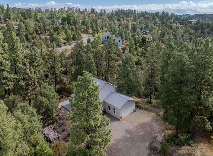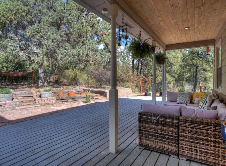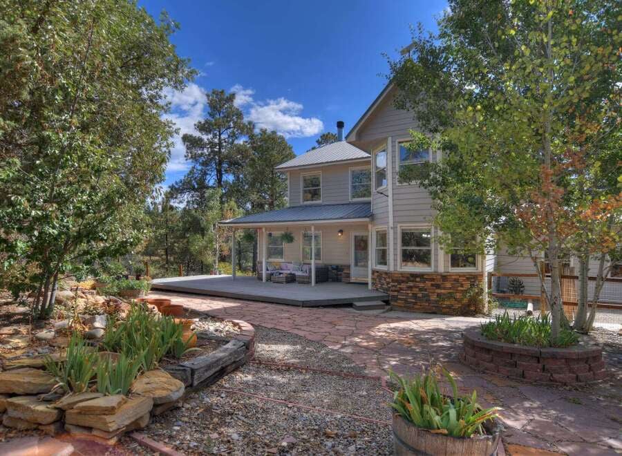 This home with farmhouse style is tucked into a wooded lot in the foothills of western Durango, on private paved roads with comfort and convenience. The lot is located in a quiet neighborhood and is only about 15 minutes from downtown, consisting of Ponderosa Pine, Pinon, Juniper and Gambel Oak. Enjoy sunset views from the covered porch and landscaped garden and take in the sunrise from the balcony off the breakfast room. This enchanting family home offers a serene escape with views of the woods...