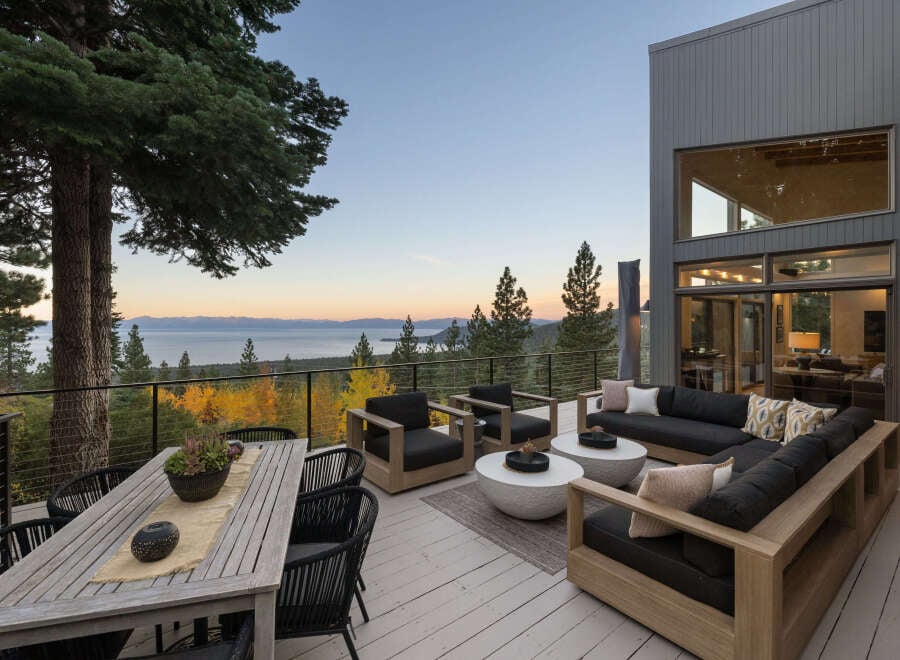 Remarkable estate with panoramic lake views and situated on over a one-acre parcel. This private, gated lake view estate offers a contemporary flare with clean lines and walls of glass to take in the breathtaking views. Expansive living areas featuring cathedral beamed ceilings and south-facing decks are perfect for entertaining friends and family, and enjoying the stunning sunrise and sunsets of Lake Tahoe. Primary suite is located on the main living level while separate family room, three gues...