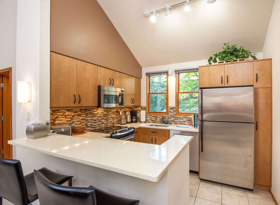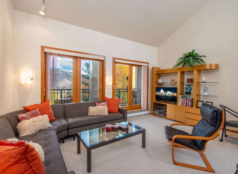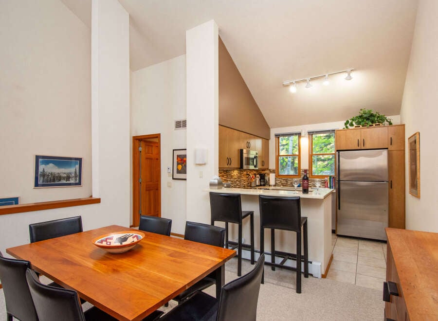 Wonderful ski in/out two bedroom, three bath townhome living with soaring vaulted ceilings, abundant natural light, and a thoughtful separation of spaces that creates both openness and privacy. The updated kitchen blends seamlessly with the dining area, forming a warm and inviting gathering space. A towering wood-burning fireplace provides a beautiful focal point and subtle division between the dining and living areas, the perfect spot to unwind after a day on the slopes and share stories from t...