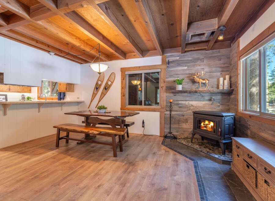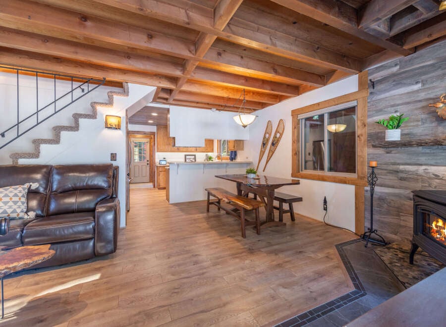 Just a few blocks from the public dock at beautiful Serene Lakes, this charming 3-bedroom, 2-bath cabin offers the perfect balance of vintage charm and modern comfort. Built in 1966 and thoughtfully updated, this 1,280 sq ft home invites you to relax and unwind in the heart of the mountains. Step inside to find exposed beam ceilings, a cozy and efficient pellet stove with a custom tile hearth and log mantle, and new luxury vinyl plank (LVP) flooring throughout the home. The open living and dinin...