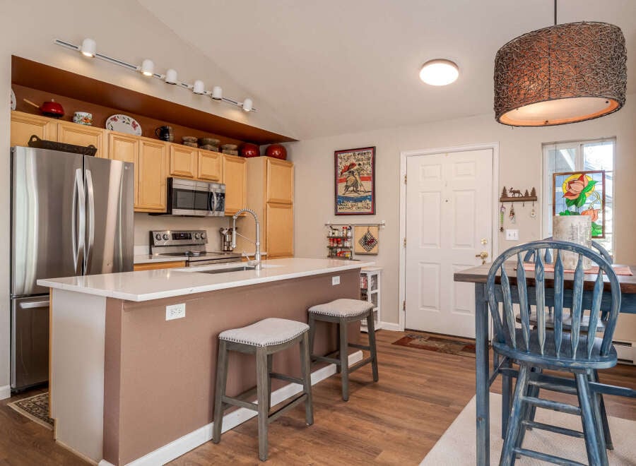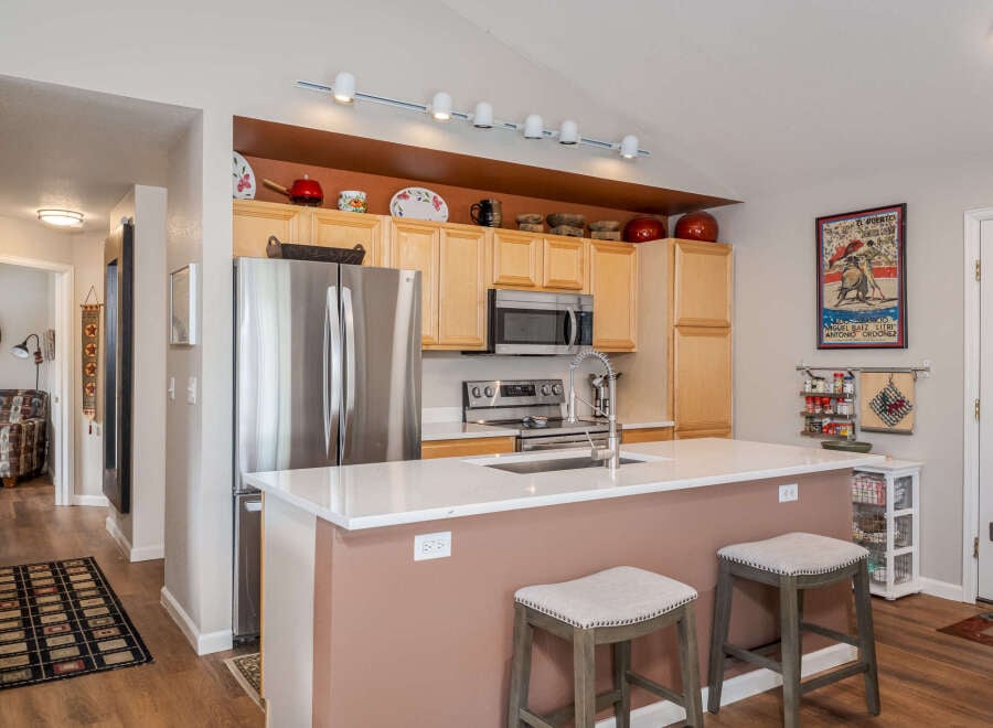 Welcome to the Villas at Walton Creek Community! This top-floor, two-bedroom, two-bathroom home is move-in ready! Located at the back of the complex, the unit features vaulted ceilings, with an open floor plan and mountain views. Upgrades include new quartz countertops, stainless steel appliances, and newly upgraded flooring. Two sliding glass doors lead to a private deck that overlooks a lovely grassy area. The home is being sold partially furnished with a washer and dryer. There is an attached...