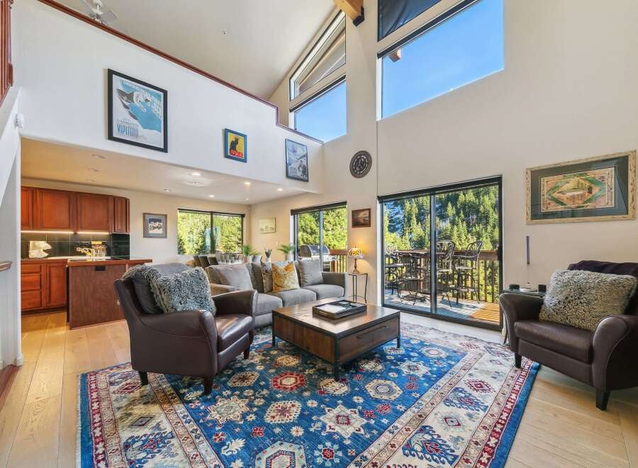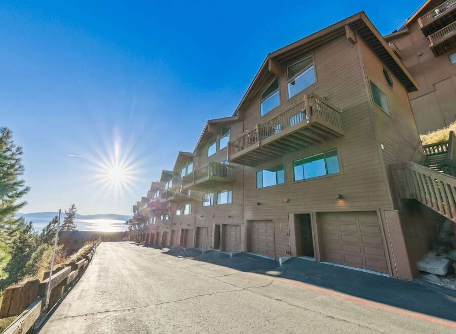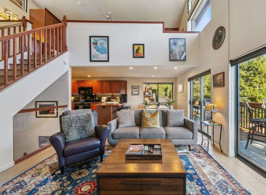 Welcome to your Tahoe escape nestled in Alpine feel of Bitterbrush. This corner unit with breathtaking panoramic views of Lake Tahoe, Diamond Peak, and the surrounding Sierra peaks—your own private show of nature’s beauty, day and night. The home offers:Two spacious bedrooms, ensuite full bath Additional half-bath upstairs, dramatic living room with soaring cathedral ceilings Loft area with built-in cherry wood bookcases and storage—perfect for a home office or guest hideaway Rich touches throug...